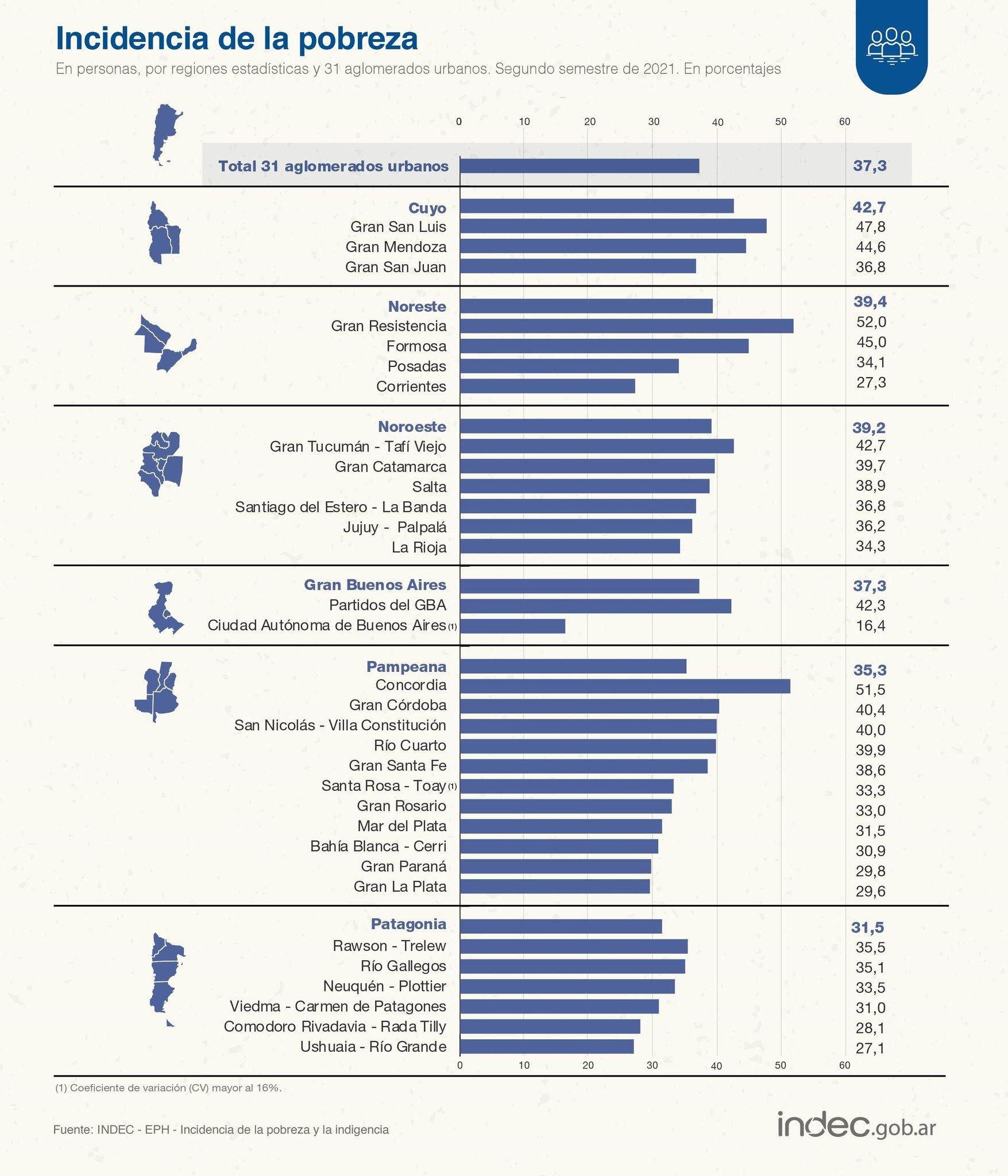 Dentro del 42,7% con el que la región de Cuyo se ubicó en la peor situación regional del país, el conglomerado urbano del Gran Mendoza presentó un 44,6% de su población bajo la línea de pobreza, según mediciones de la Encuesta Permanente de Hogares (EPH) del Indec.