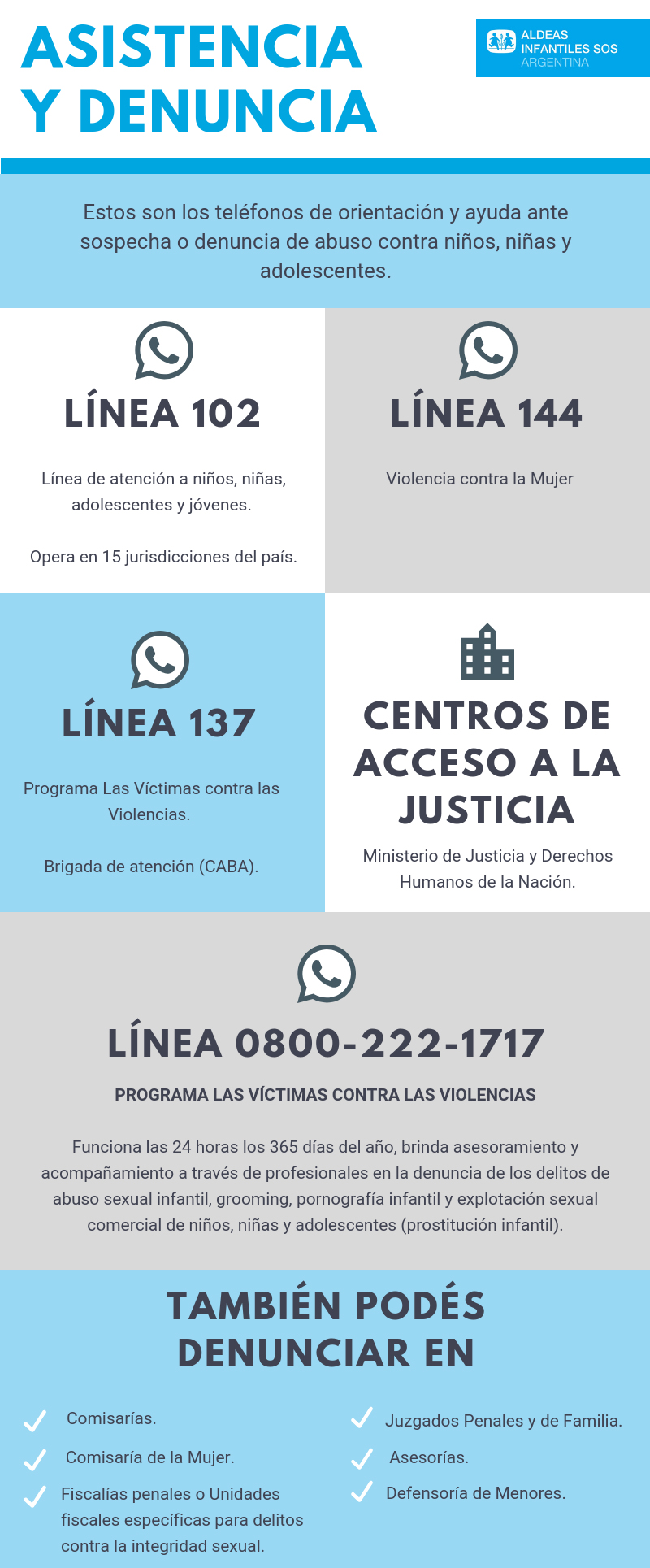 Funciona las 24 horas los 365 días del año, brinda asesoramiento y acompañamiento a través de profesionales en la denuncia de los delitos de abuso sexual infantil, grooming, pornografía infantil y explotación sexual comercial de niños, niñas y adolescentes (prostitución infantil).